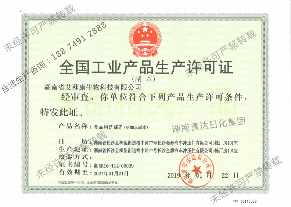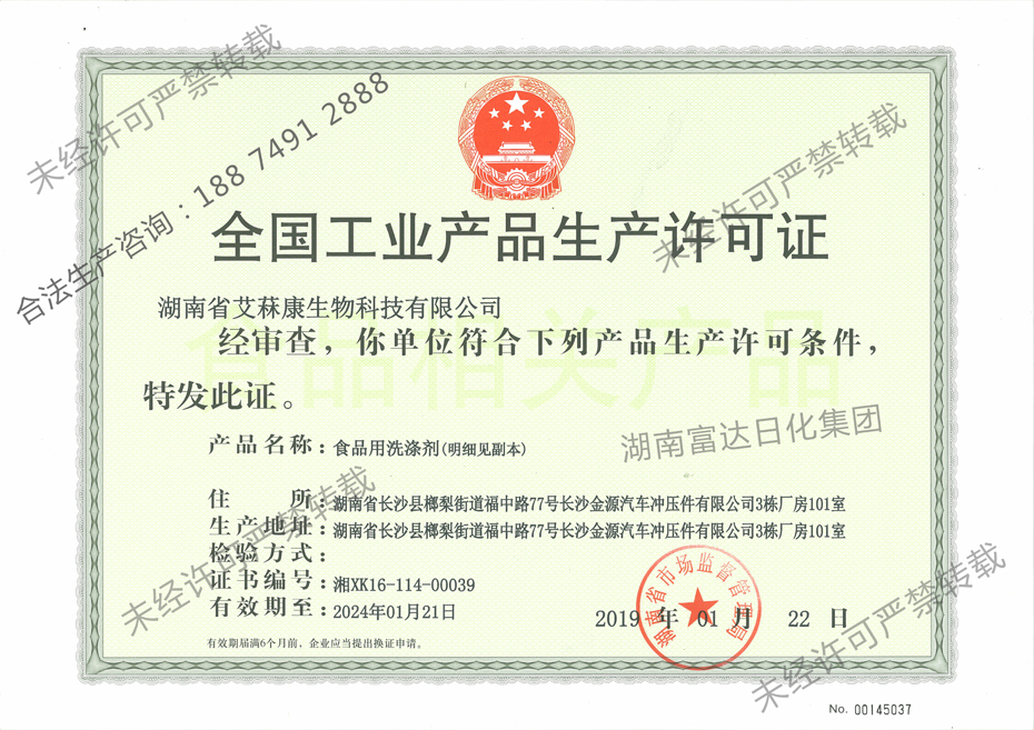 多項專利發(fā)明人王先軍 手機:150-7483-5702 手機:195-7316-0288湖南富達日化順利通過湖南省市場監(jiān)督管理局的各項審核,成功取得了《全國工業(yè)產(chǎn)品生產(chǎn)許可證》,獲得食品用洗滌劑(手洗餐具洗滌劑)生產(chǎn)資格,符合產(chǎn)品生產(chǎn)許可條件。