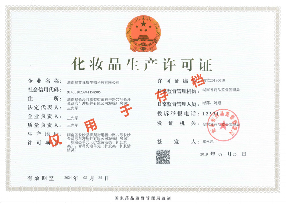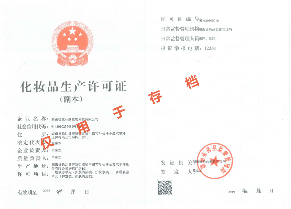多項(xiàng)專利發(fā)明人王先軍 手機(jī):150-7483-5702 手機(jī):195-7316-0288經(jīng)食藥監(jiān)局領(lǐng)導(dǎo)專家們層層審核并一致通過,富達(dá)艾菻康公司正式獲得了化妝品生產(chǎn)許可證。消息傳來,公司全體員工群情激奮,熱烈歡呼。此次順利通過現(xiàn)場(chǎng)驗(yàn)收并取得化妝品生產(chǎn)許可證,標(biāo)志著公司已完全具備了生產(chǎn)和銷售一般液態(tài)單元(護(hù)發(fā)清潔類、護(hù)膚水類);膏霜乳液?jiǎn)卧ㄗo(hù)發(fā)類、護(hù)膚清潔類)的資質(zhì),這將成為公司進(jìn)軍化妝品行業(yè)的新起點(diǎn)。