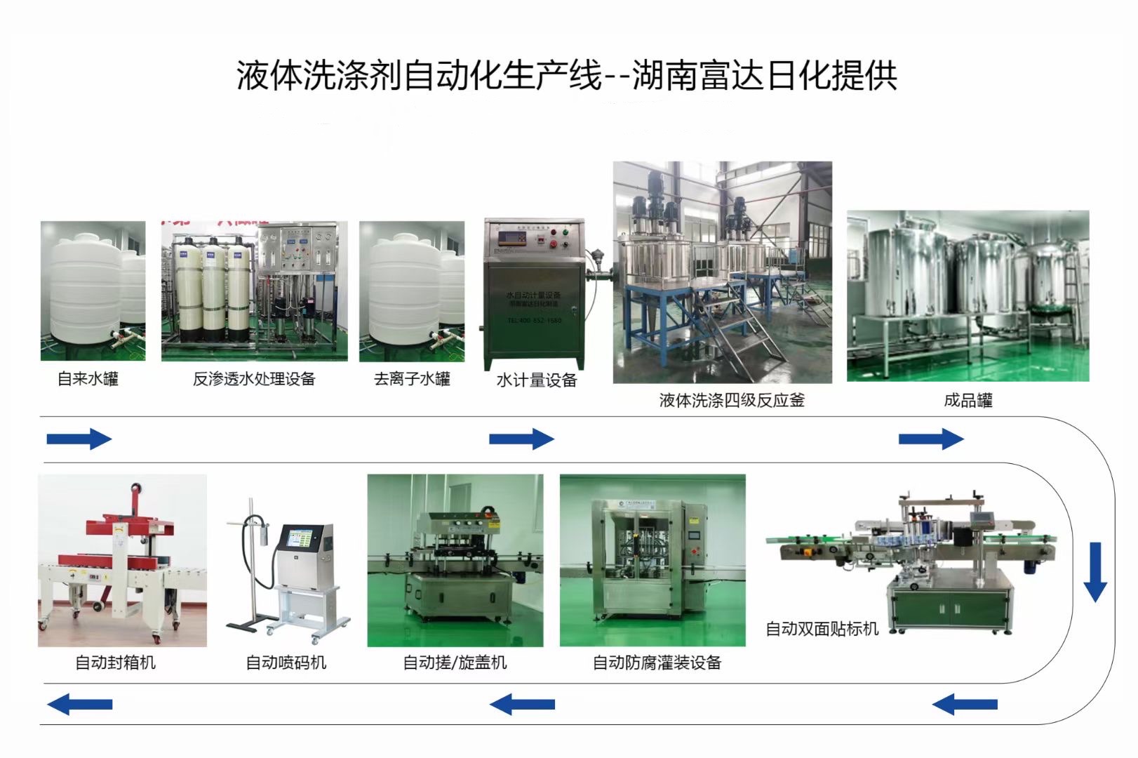 包含以下部分:專用水處理設備、反應釜(含乳化、攪拌功能)、定量灌裝機、旋蓋機、專用印碼器、封箱機等。富達日化為您詳細介紹各設備的功能和具體用途。