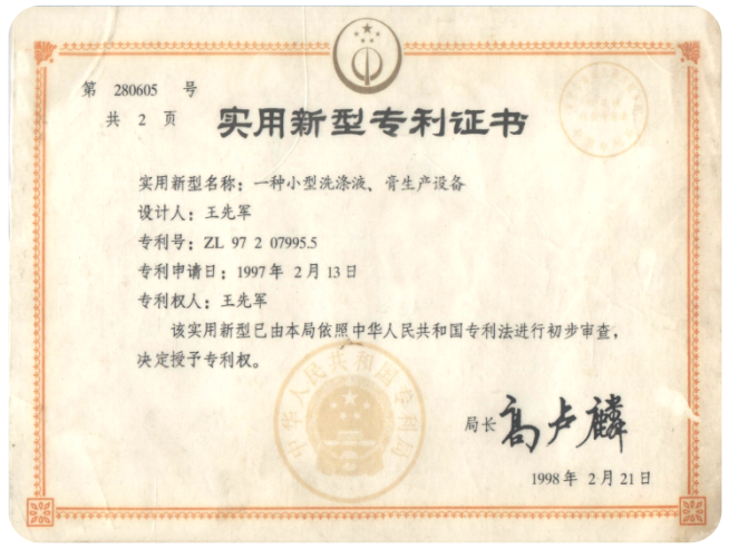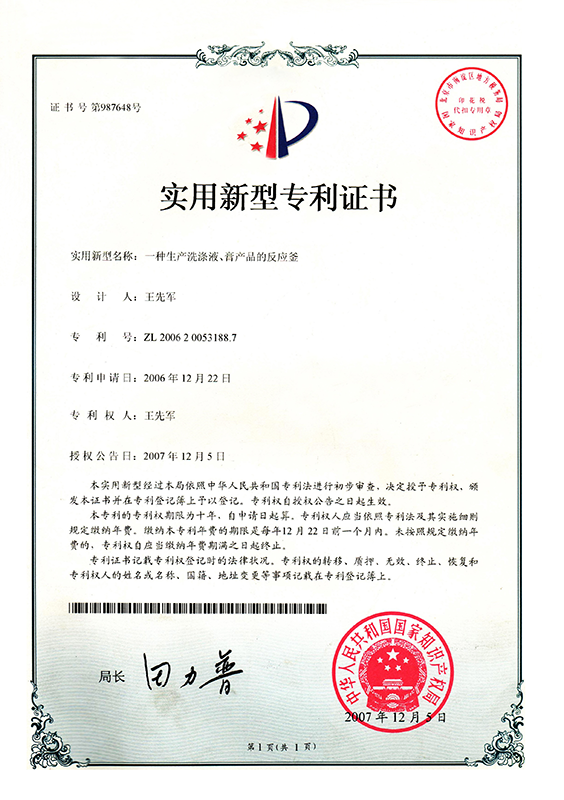 1997年2月曾獲一種小型洗滌液、膏生產(chǎn)設(shè)備國家專利 |
