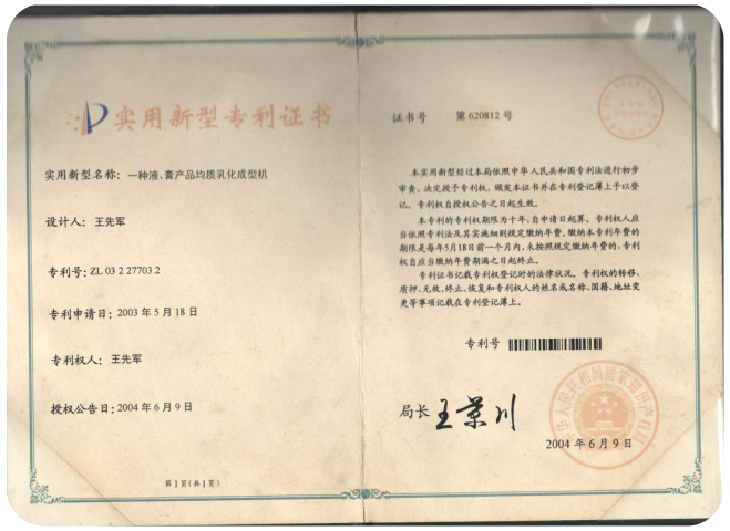 2003年5月曾獲液、膏產(chǎn)品均質(zhì)乳化機(jī)國家專利 |