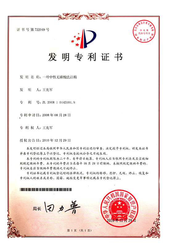 2008年08月曾獲得液體洗滌劑技術(shù)發(fā)明專利 |