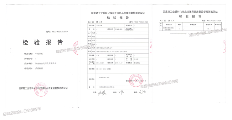 2016年12月,由富達(dá)日化自主研發(fā)的車用尿素到國(guó)家輕工業(yè)香料化妝品洗滌用品質(zhì)量監(jiān)督檢測(cè)武漢站檢測(cè),根據(jù)GB2440-2001《車用尿素》等檢測(cè)依據(jù),送檢的產(chǎn)品符合標(biāo)準(zhǔn)要求。