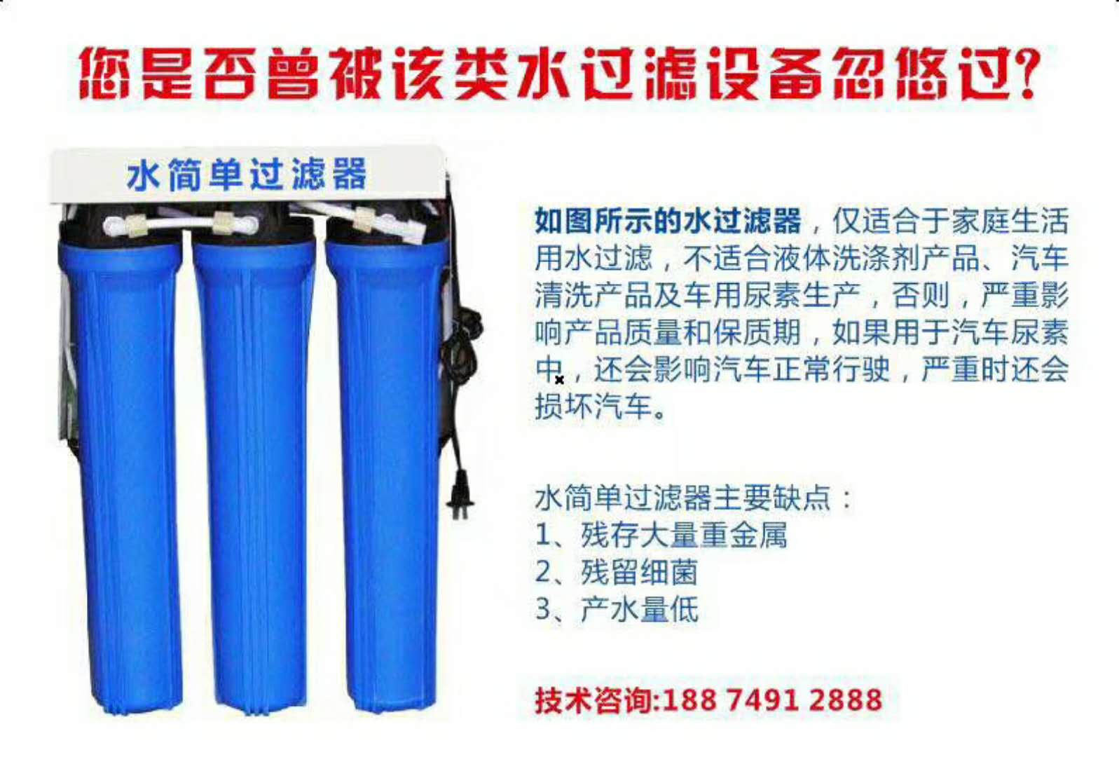 如圖中水處理只能對(duì)水進(jìn)行簡單過濾,如果購機(jī)者發(fā)現(xiàn)車用尿素設(shè)備銷售商采用這種單個(gè)或連續(xù)三個(gè)并排鏈接的藍(lán)色過濾器,一是出水產(chǎn)量低,二是過濾器容易堵塞,三是無法去除水中的重金屬和細(xì)菌,只能用于家庭用水的簡單過濾,不能用來處理生產(chǎn)車用尿素的水,淘寶價(jià)格僅90元每個(gè)。